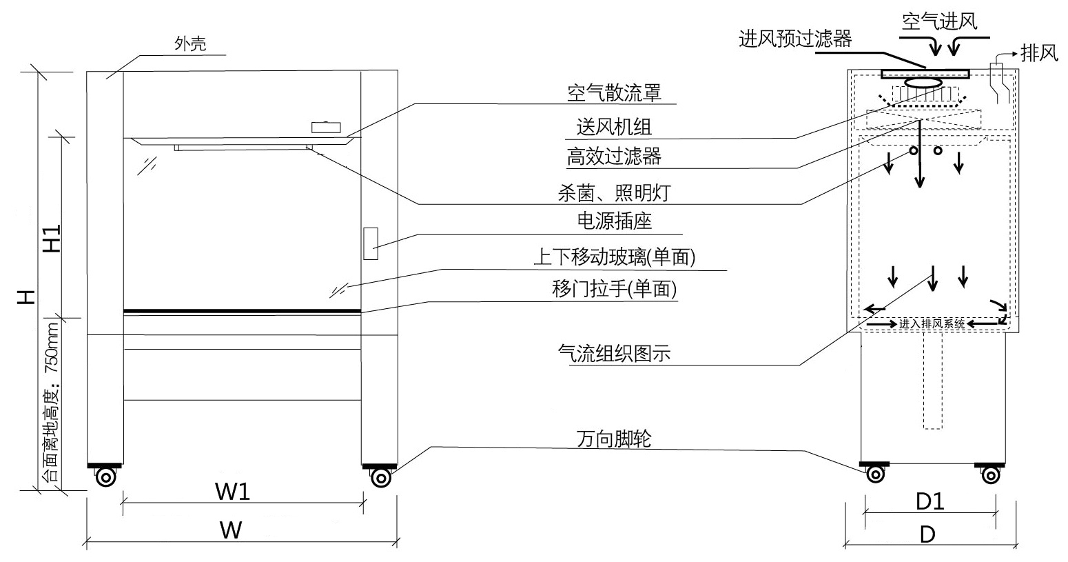凈化工作臺由箱體、風機、高效過濾器、操作開關等幾大部件組成。箱體采用彩鋼板等制作,表面噴塑處理,工作臺面采用不銹鋼制作。凈化單元采用了可調風量的風機系統,通過調節(jié)風機的工作狀態(tài),可使?jié)崈艄ぷ鲄^(qū)中的平均風速保持額定范圍內,而且有效地延長了高效過濾器使用壽命。